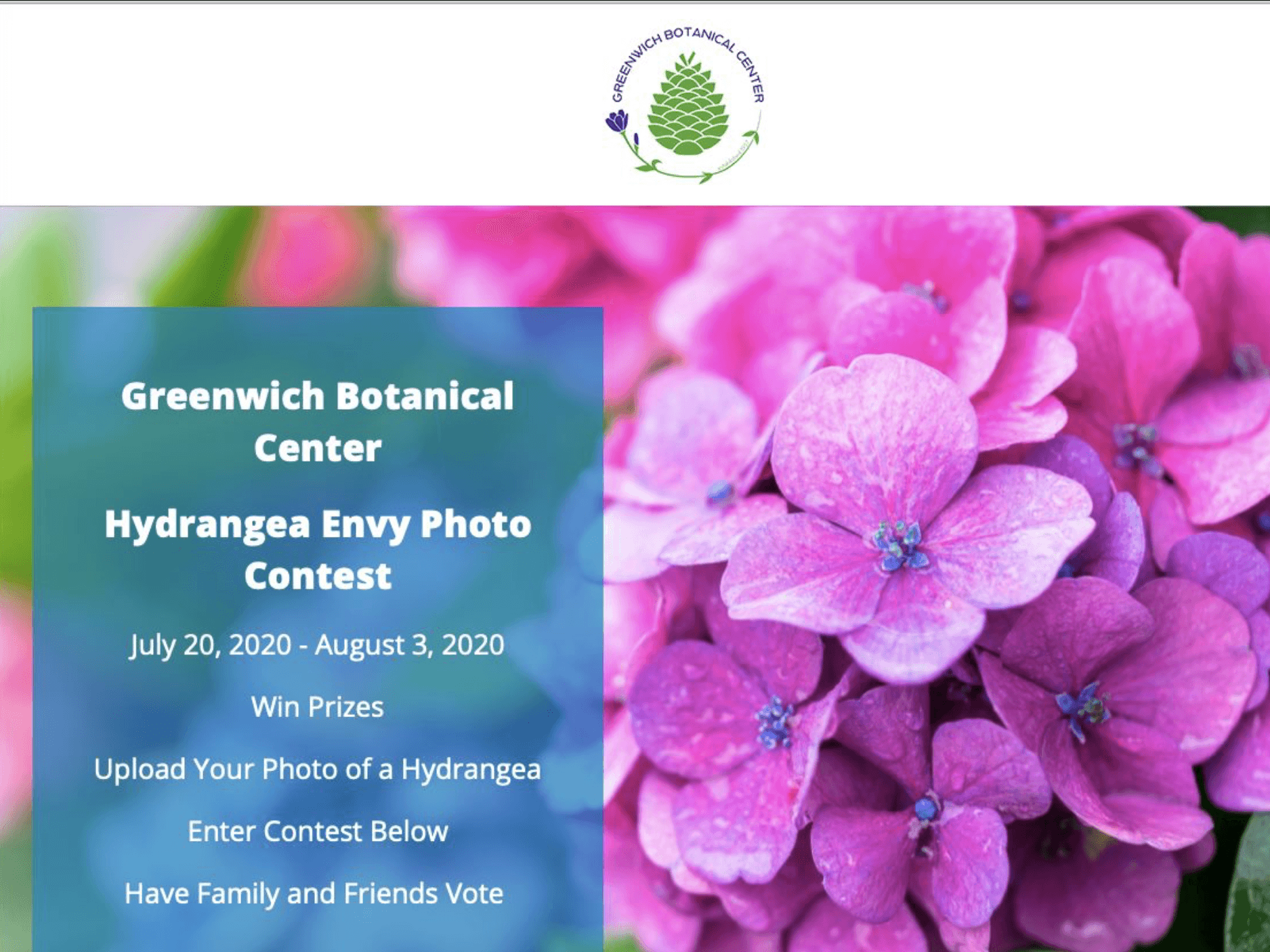 "Hydrangea Envy"was a photo contest run by the Greenwich Botanical Center (GBC) (GBC) to engage the community, showcase beautiful gardens, and promote horticulture, where residents submit photos of their hydrangeas for prizes like plants and garden consultations.
