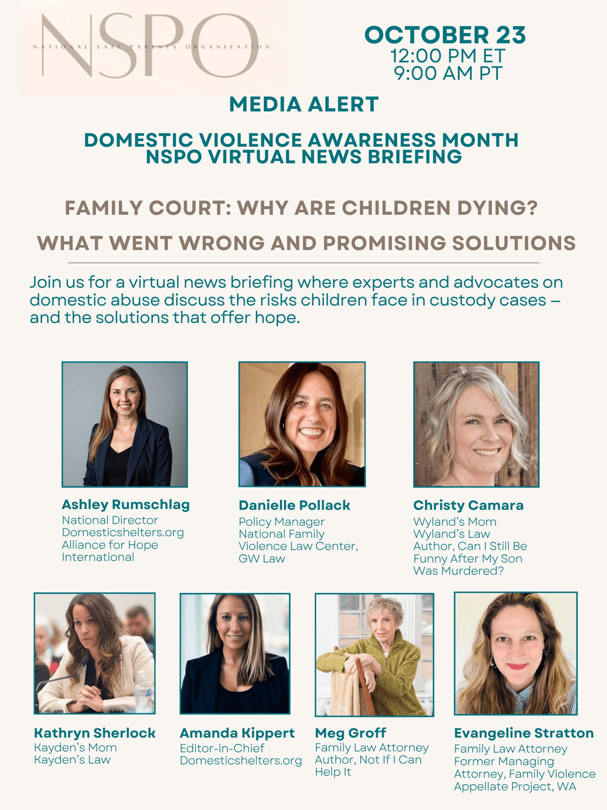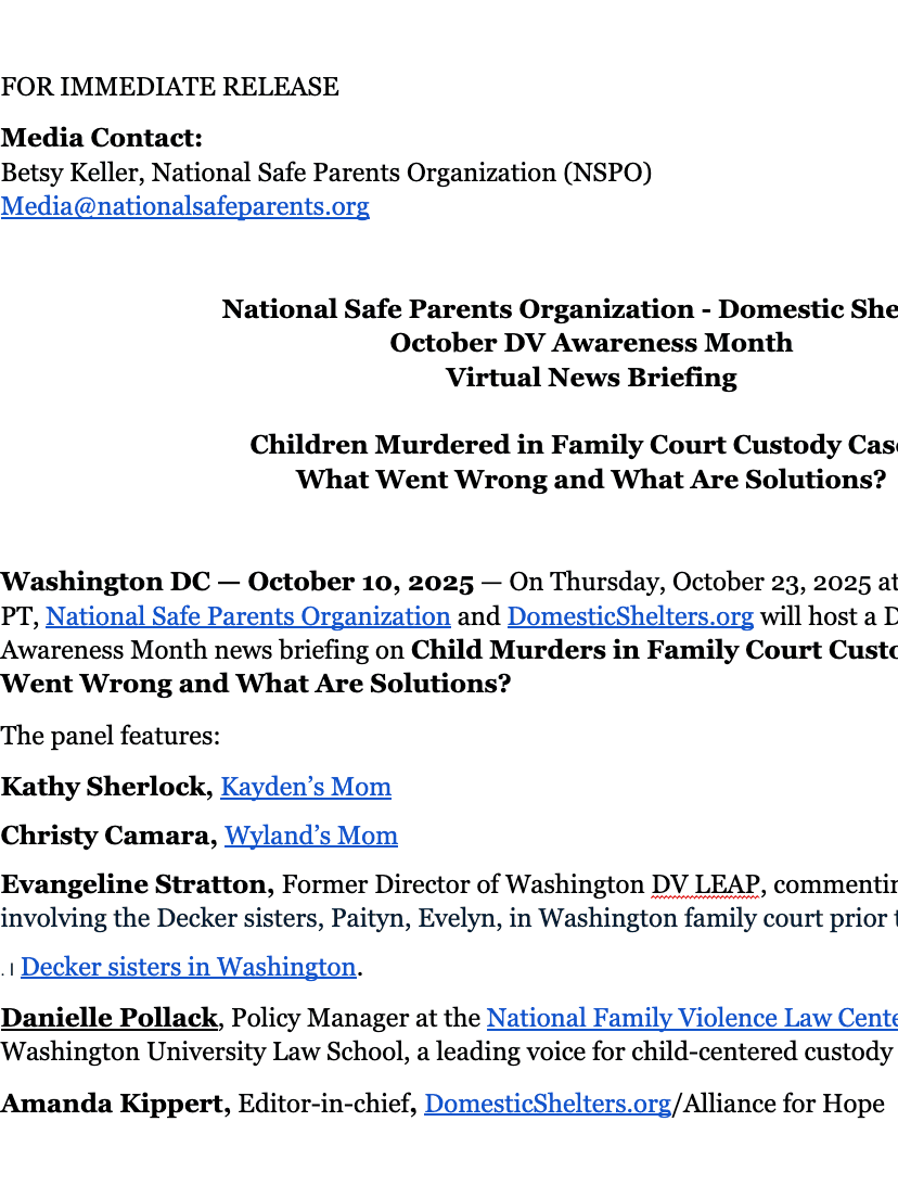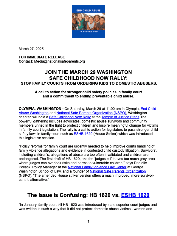 National Safe Parents Organization (NSPO) is the leading grassroots organization working to advance evidence-based policies and laws to improve U.S. family court practices and ensure child safety is at the center of all child custody decision-making. NSPO engages decision-makers, builds community, and raises public awareness on these issues affecting children and safe parents. We work across the U.S. and in tandem with international partner organizations and leading research organizations.