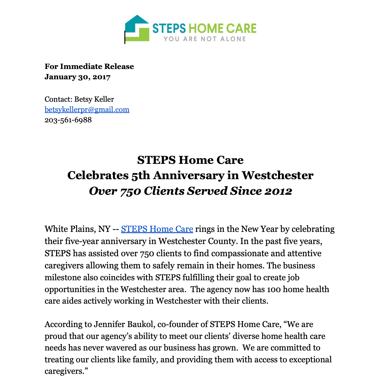 Steps Home Care Celebrates 5th Anniversary in Westchester. 2017